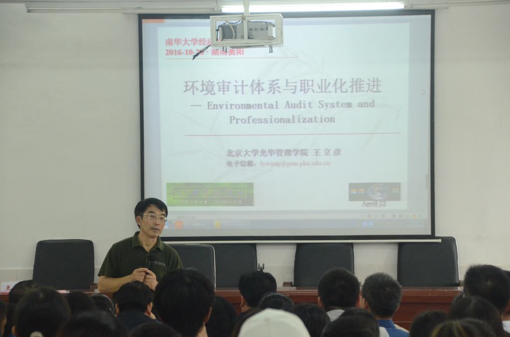 10月20日下午,由南华大学人文社科处、经济管理学院主办的主题为《环境审计体系与职业化推进》的学术报告会在南华大学经济管理学院MBA学术报告厅顺利举行,特邀北京大学光华管理学院王立彦教授给我校师生授课;经济管理学院院党委书记谢四平、副院长阳秋林连同会计专业各领导老师出席报告会,并特邀衡阳市审计局领导出席,经济管理学院本科、硕士生及对于此专业有兴趣的学生聆听报告会。