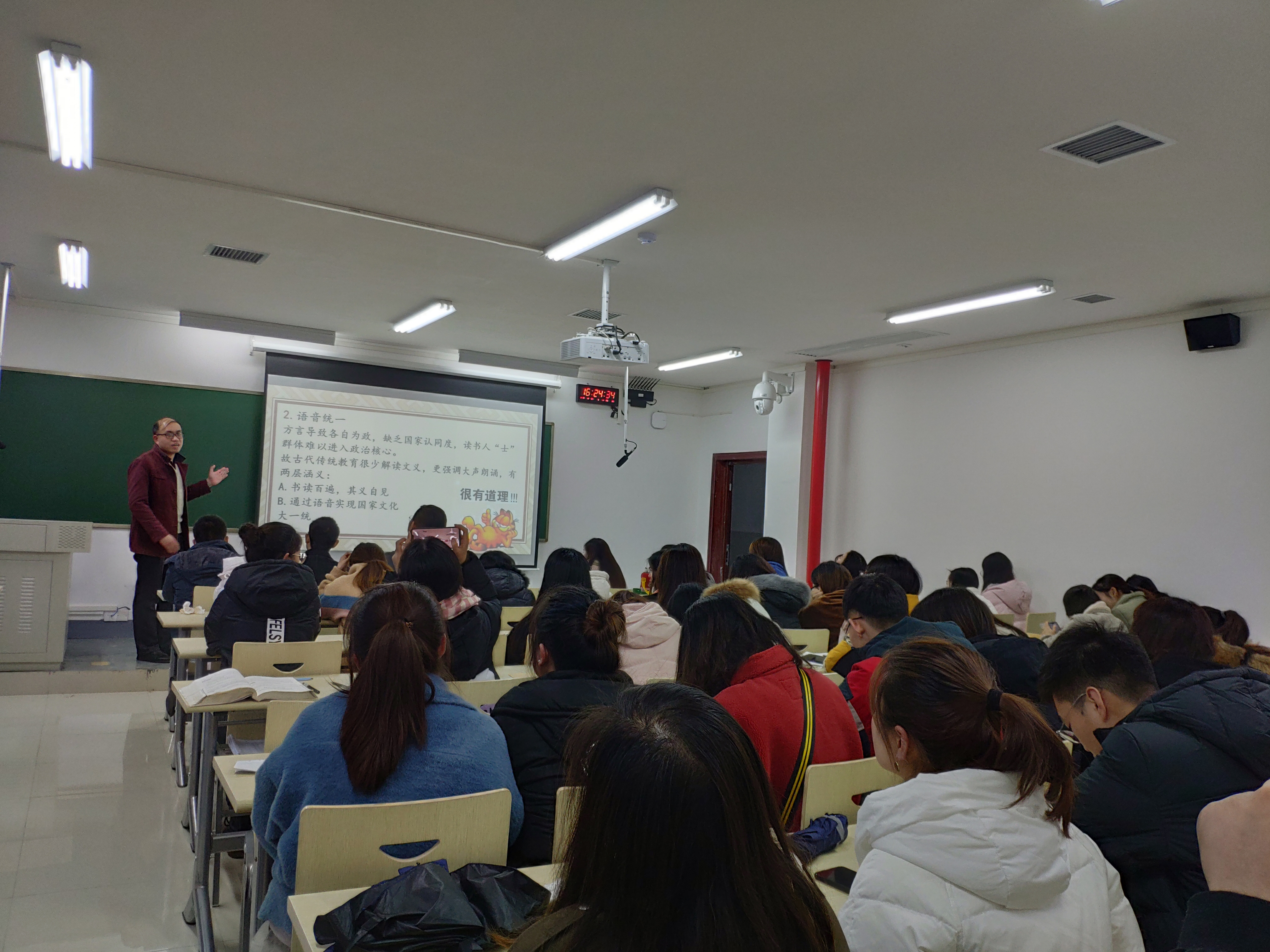 讲座开始,欧阳爱辉博士先由2019年10月31日,中共第19届中央委员会第四次全体会议通过的《中共中央关于坚持和完善中国特色社会主义制度推进国家治理体系和治理能力现代化若干重大问题的决定》引出讲座的主题古代中国国家治理与法治。自国家产生以来,如何实现国家优良治理一直是执政者脑海中的大问题,而中国深厚的历史背景,特殊的国情,又构成中国国家治理的复杂背景,这时候理顺中国古代法治的发展进程就显得尤为重要。同时欧阳老师向同学们阐明了文学作品和探究中国古代国家法治的关系,文学作品虽与官方史料有所差异,甚至有些许怪诞,但其本源还是来自作者最基本的社会生活,文学叙事在一定程度上是对国家和历史生活的再现,法律和文学是相辅相成的,法律能使文学变得深刻,文学作品使法律变得更加通俗,但借助古代文学思考法律问题时,不能过分拔高其价值,毕竟文学叙事终究和严格意义上的法律有本质区别。
