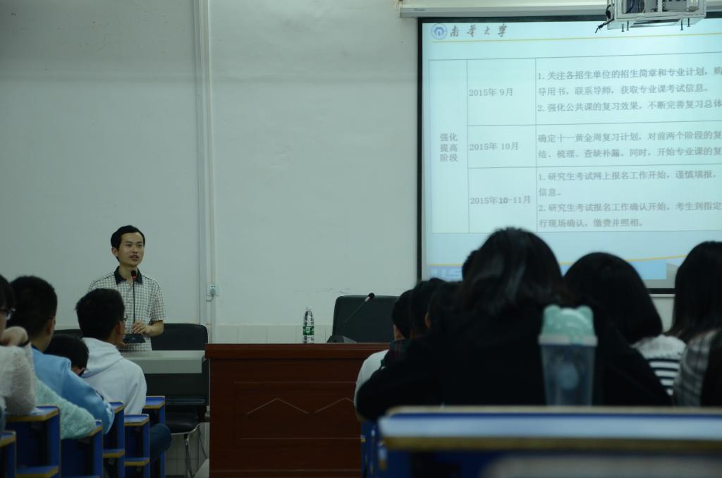 在11级的黄杨程、唐佩虹上台分享考研经验后,副院长刘文君做考研动员报告。他指出,明确的目标能够让付出的努力事半功倍,并从确立目标出发,对今年研究生的录取趋势、考研的心理准备和我校考研的相关政策都做了细致的讲解。