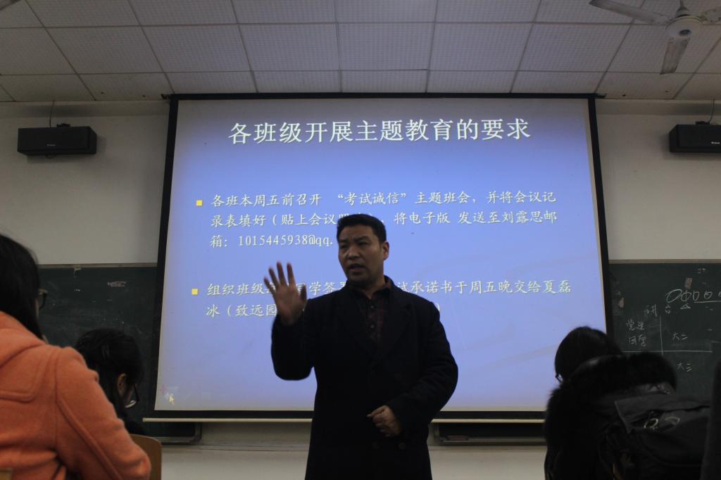 会议由学工室负责人汪胜春主持。汪老师首先带领与会干部一起学习了有关考试诚信的法律规定及学校的相关制度规范,并着重介绍了学院“学法律、讲诚信、促学风”主题教育活动安排和具体要求;并对即将进行的四六级考试流程和要求做了详细解读。