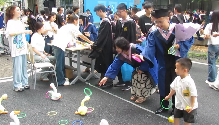 踏入青春集市,毕业序章正式开启。在鲜花签到墙处,以青春寄语换花簇,留下专属毕业印记;移步照片墙打卡区,与同窗共忆四载笑泪交融的片段,重拾珍贵过往;参与“套大鹅”互动,在欢笑声里收获满载青春气息的趣味小礼 ;书写心愿的纸飞机,将携愿翱翔,划过毕业天空;投壶游戏中,直指筒心,寄寓前路顺遂…在茶歇区,精致点心与清凉饮品已备妥,补充能量的同时,一起开启这场毕业快闪的温暖序章!