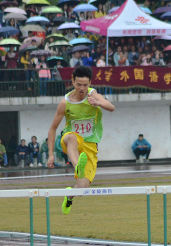 赛前,跑道上跨栏列队整齐,运动员们热身后进入赛道,蓄势待发。赛场如战场,一声枪响,运动员们如离弦之箭,奋力起跑。穿着绿色运动服的肖扬天如一道绿色的光,穿梭在红色的跑道上。奔跑,抬腿,落地,每一步都矫健有力,每一跃都身轻如燕,每次跨栏而过都让经管观众席鼓声如雷,掌声如雨,沸腾不已。最后在所有人关注的目光下,肖扬天冲到终点,取得第一。