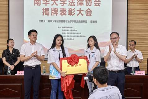 会议第二阶段,由南华大学beats365唯一官方网站党委副书记谭德明主持。团市委书记王致伟、南华大学团委书记刘振中为南华大学法律协会揭牌,并为南华大学法律协会会长团颁发聘书。我校全体法学系师生共同见证法律协会的成立,现场响起雷鸣般掌声。