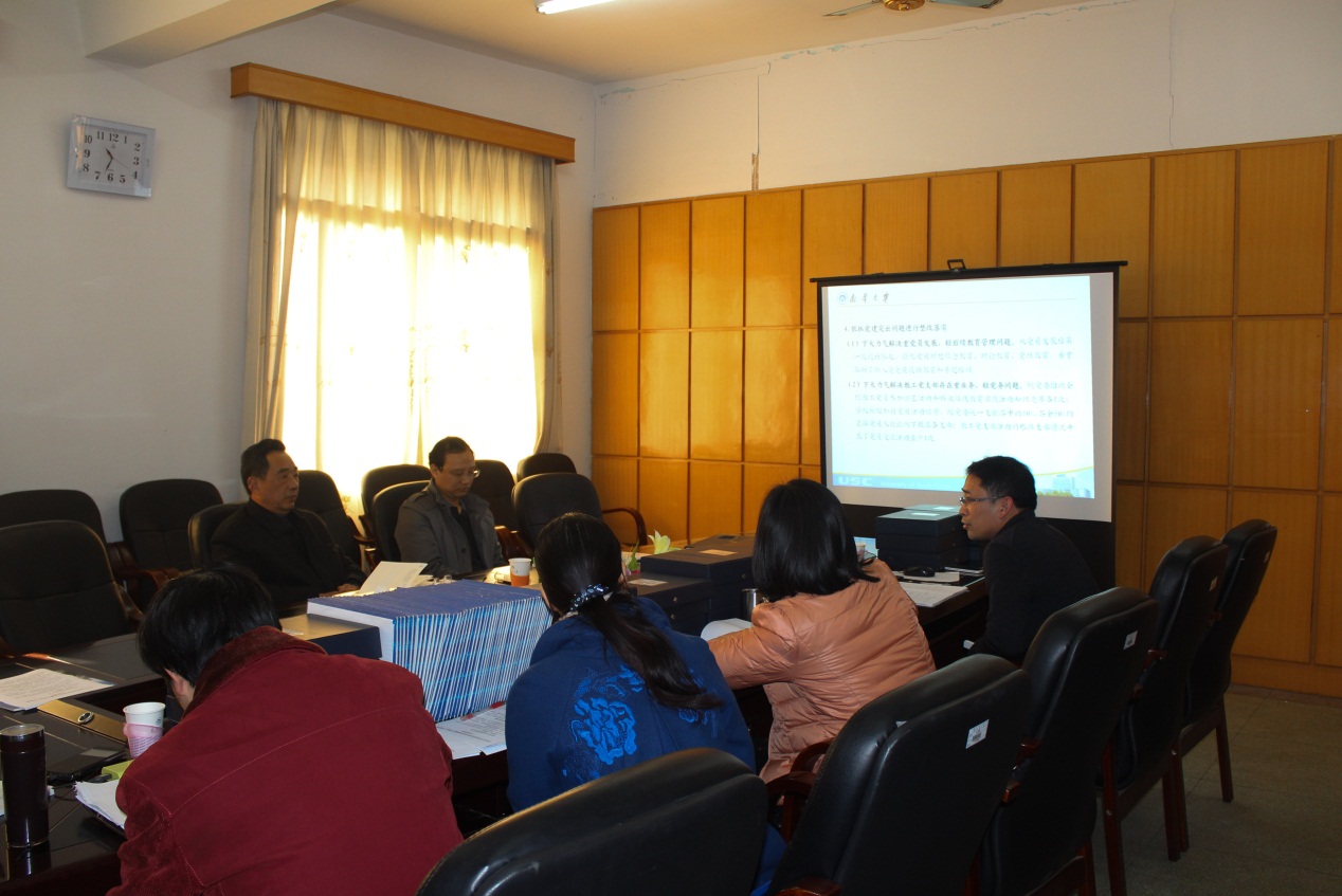 会上,院党委书记谢四平就学院党建工作作主题汇报。谢书记向督导组一行介绍了学院基本情况,并从学院党建主要工作、工作特色与成效、目标与方向三个方面,就学院如何严格落实基层党建重点任务、加强领导班子干部队伍建设、加强党风廉政建设和宣传思想政治工情况进行了详细汇报。谢书记在汇报中特别强调,学院作为校党委书记邹树梁基层党建工作联系点,各项工作的开展得到了邹树梁书记的悉心指导和大力支持。谢四平表示,院党委将进一步切实强化主体意识、强化党员身份意识、强化党组织服务意识、强化发展意识,按照校党委要求的“好干部”“好党员”标准,建设适应学院科学发展的干部和党员教师队伍,以深入推进助群众路线教育实践活动整改落实工作为契机,切实加强党员干部作风建设与师德师风建设,全面加强和改进基层组织建设,推动学院科学发展。