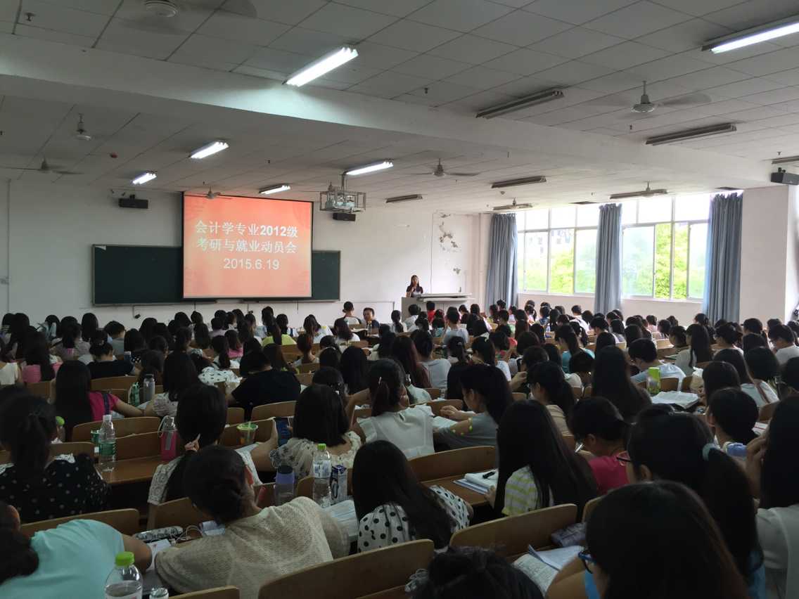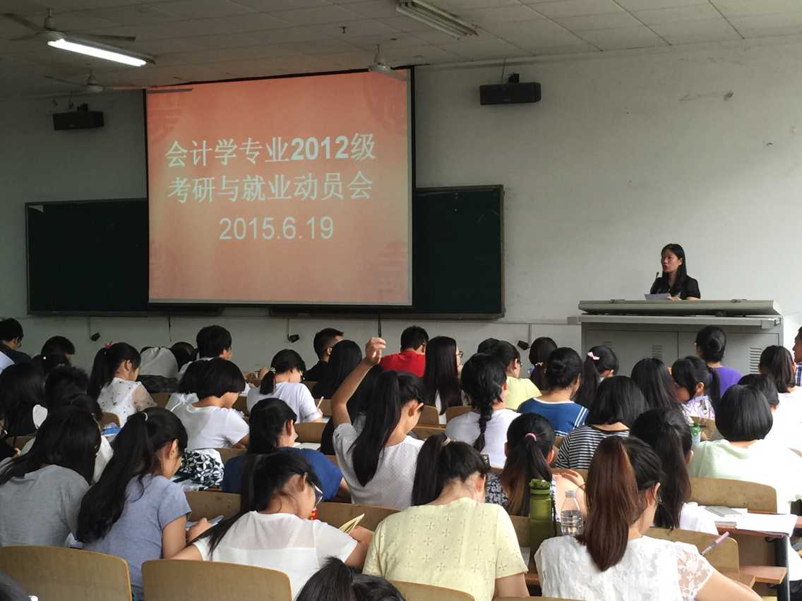 6月19日上午,我院会计专业2016年考研与就业动员大会1-112成功举行,这也是我院今年考研与就业动员大会的最后一场。院党委副书记廖迎春、会计系主任胡海波、就业专干苏玲出席,就考研、就业的相关事宜对现场的200余名会计学专业学生进行了指导。