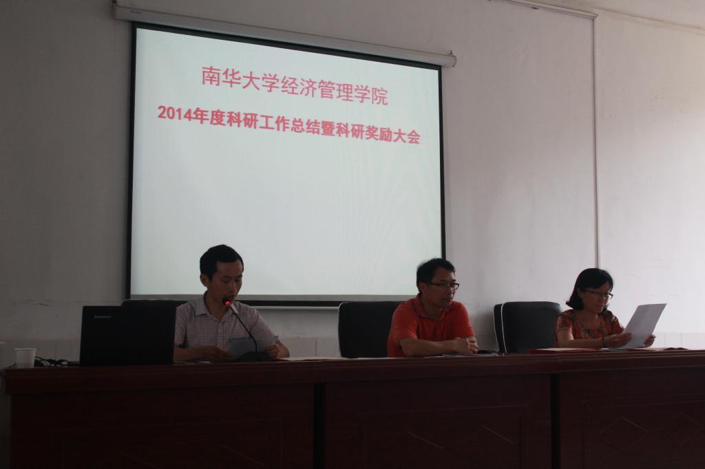 6月25日下午,经济管理学院2014年度科研工作总结暨科研奖励大会于MBA学术厅举行。经济管理学院党委书记谢四平,副院长王铁骊、刘文君出席,全体教职工参加学习。大会由王铁骊主持。