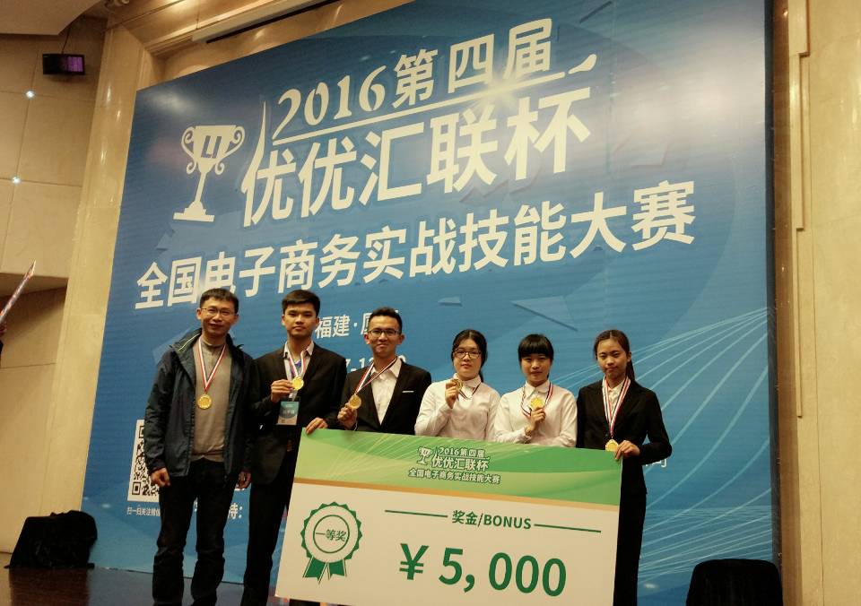 2016年12月18日,第四届“优优汇联杯”全国电子商务实战技能大赛总决赛于厦门杏林湾大酒店落下帷幕。我校由经管学院陈甲华老师指导,由经管学院黄燕婵、朱一菲、护理学院张彤、机械学院张佳群,计算机学院麦志辉5名队员组成的风信子团队获得本科组的一等奖.本次大赛共有480多支团队、1800余名学生参赛。最终本科组高职组中职组分别决出特等奖1项,一、二等奖各2项,三等奖5项。