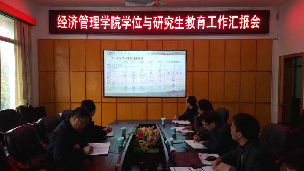经济管理学院副院长陈南岳汇报了经济管理学院学位与研究生教育的基本情况、博士点申报工作、会计专业硕士的相关工作及2017年研究生生源组织情况;院党委书记谢四平就博士点申报、各学位点平衡发展及学院十三五规划中学位点建设目标等问题进行了补充汇报。