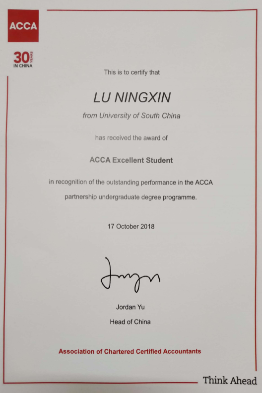 2018年10月,beats365唯一官方网站2017级ACCA创新实验班鲁宁馨同学因学习优异,荣获ACCA官方颁发的“ACCA优秀学员”荣誉称号及1000元奖学金。