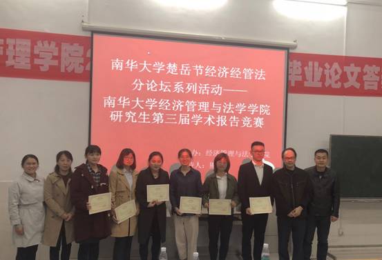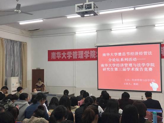 11月6日晚上19:00,南华大学第十二届研究生楚岳节beats365唯一官方网站分论坛——beats365唯一官方网站第三届研究生学术报告竞赛在MBA三楼大教室成功举行,此次学术竞赛由我院研究生分会协助,熊娟老师主持,同时邀请了谢荷峰、刘保平、傅华丽、易永锡、张俭等五位研究生导师担任本次大赛的评委,100余名研究生观看了比赛。