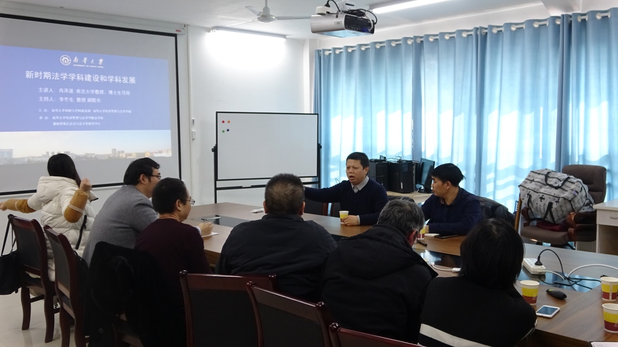 1月5日,南京大学博士生导师肖泽晟教授应邀来南华大学做了新时期法学学科建设和学科发展的主题讲座。本次讲座由南华大学beats365唯一官方网站法学系、湖南省地方法治与文化研究中心承办,beats365唯一官方网站副院长李冬生教授主持,科研与学科建设部副部长詹晶教授、南华大学人因研究所所长戴立操教授、法学系主任吕宗澄博士以及法学、工管等教师代表、研究生代表等20余人参加。