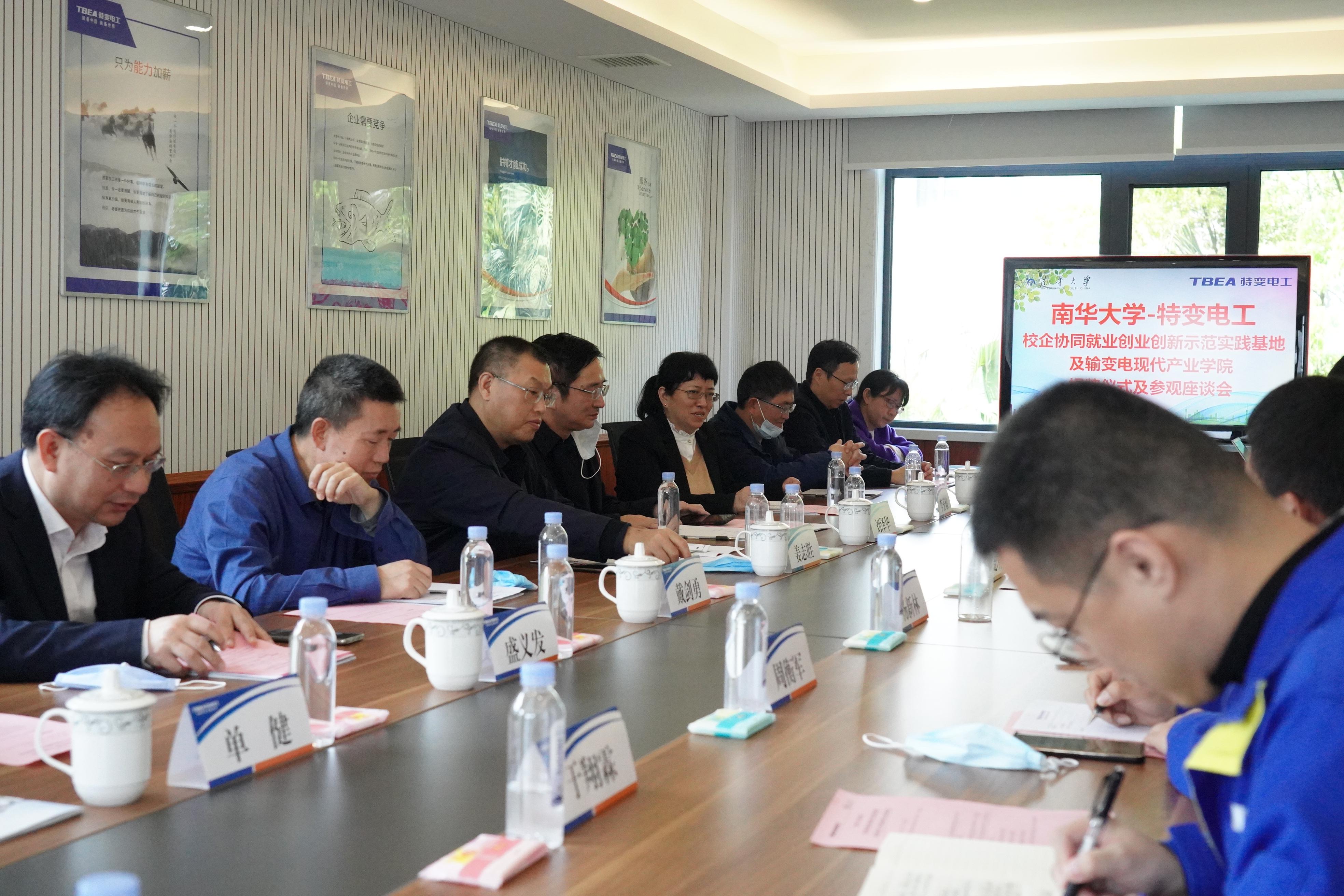 3月29日,南华大学党委委员、副校长姜志胜教授,教务部部长刘泽华、副部长戴剑勇,经济管理与法学院院长李玉琼、副院长陈鸣、教务室段雨竺,电气工程学院和计算机学院相关领导等一行十二人赴特变电工衡阳变压器有限公司进行实地参观、洽谈,并为校企协同就业创业创新示范实践基地/输变电现代产业学院揭牌,特变电工衡阳变压器有限公司副总经理朱志勇、龙腾,人力资源总监杨新林等进行了热情接待。