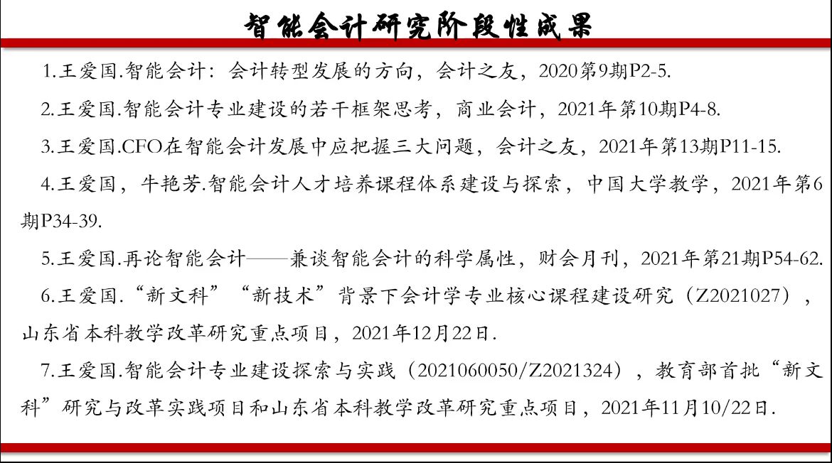 当前,我国正处于人工智能发展的关键期,人工智能释放出的科技革命和产业变革能量,深刻改变了人类生产生活方式和思维方式,推动全球企业进行数字化转型和变革。中共中央、中国国务院、教育部、国家发展改革委、财政部等部门相继出台《新一代人工智能发展规划》《关于“双一流”建设高校促进学科融合加快人工智能领域研究生培养的若干意见》等若干文件,王爱国教授的这次讲座聚焦智能会计教育与发展,紧跟国家政策和方针,共同探讨数字化新技术背景下的会计智能化转型、智能会计发展和智能会计人才培养等问题。