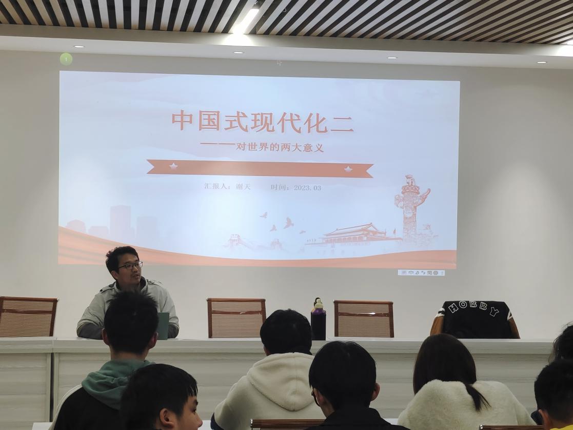 为深入学习贯彻党的二十大精神,增强思想政治教育,进一步用党的创新理论指导实践、推动工作,2023年3月5日,南华大学beats365唯一官方网站学生第八党支部以讲党课的方式开展了一场“中国式现代化对世界的伟大意义”为主题的学习活动,本次活动由经管法学院副院长谢天老师授课,学生第八党支部书记江柯桥及学生第八党支部全体党员参加。