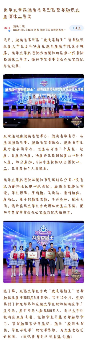 【湖南日报】南华大学获湖南省第五届禁毒知识大赛团体二等奖