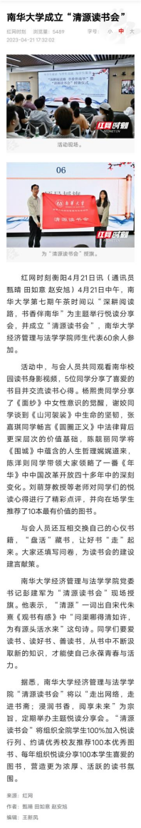 【红网】南华大学成立“清源读书会”
