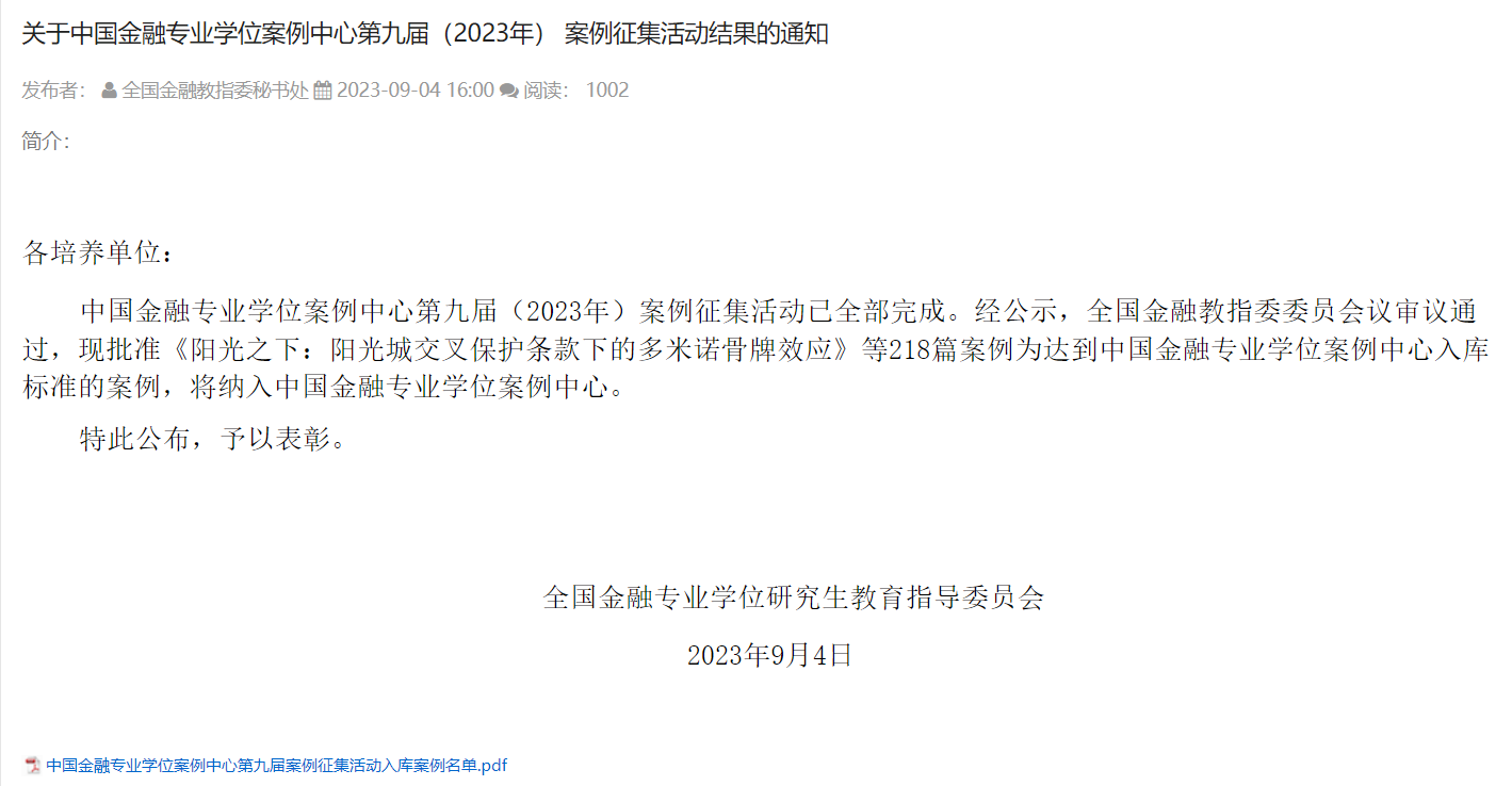 本次案例征集活动共收到有效案例1116篇,经过培养单位推荐、匿名评审、专家审议,最终评选出入库案例218篇,我院入选3篇,成绩喜人!近年来,我院十分重视案例编写、案例教学水平的提升,营造了案例编写和教学的良好氛围。本次案例入库的优异成绩,对于进一步提升我校金融专业硕士研究生的培养质量、优化应用型专业人才培养模式具有重要意义。