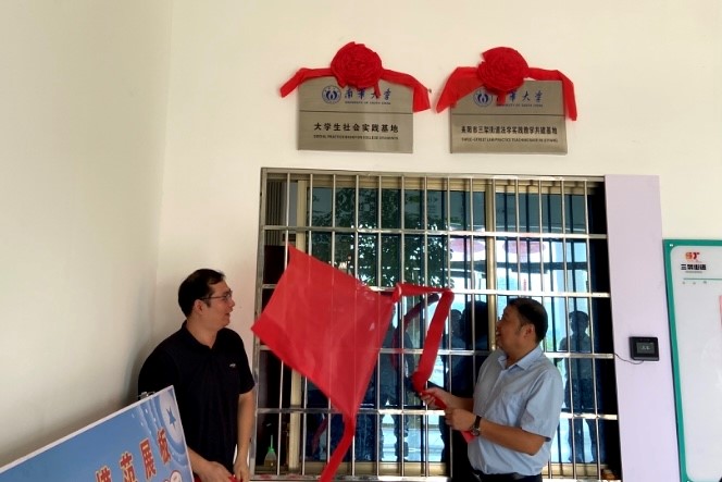 受校团委书记刘振中的委托,校团委副书记、法学系主任吕宗澄与街道党工委副书记兼政法委员贺梦铭共同为“南华大学——大学生社会实践基地”揭牌。
