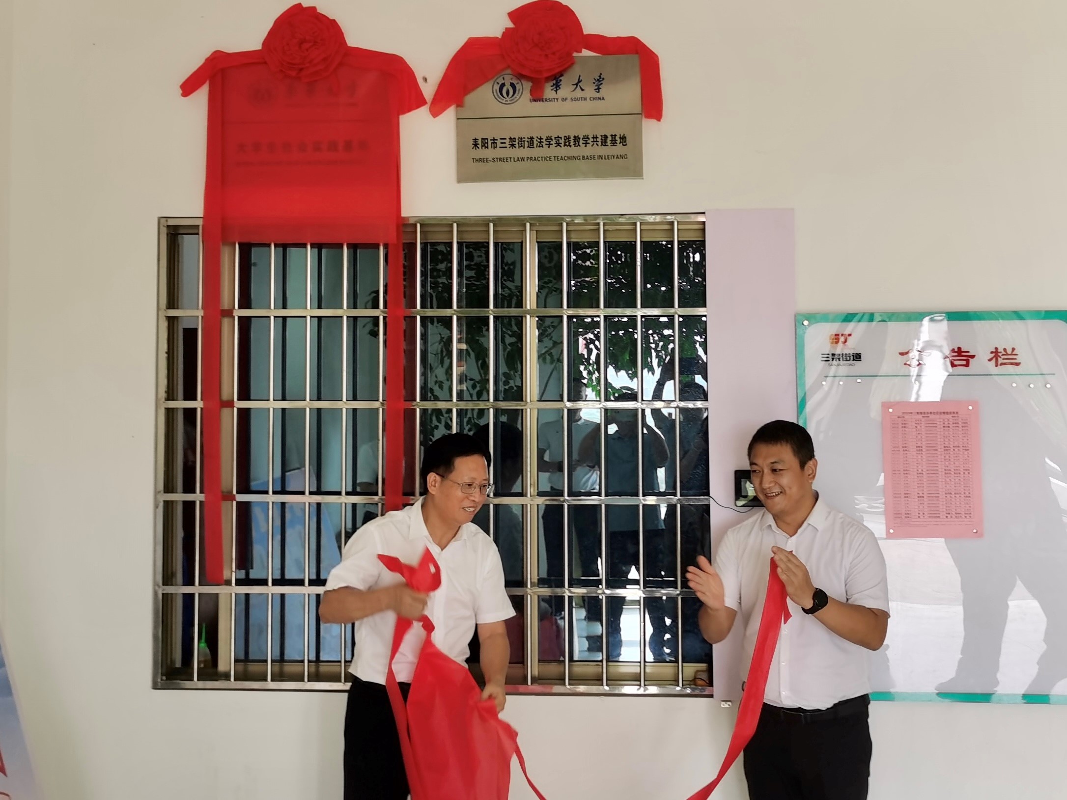 学院党委书记胡海波与街道党工委书记曹爱明共同为“南华大学——耒阳市三架街道法学实践教学共建基地”揭牌。