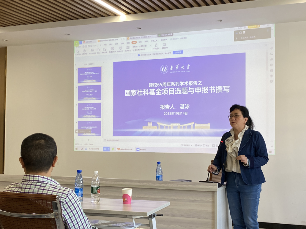 湛泳教授作题为“国家社科基金项目选题与申报书撰写”的学术报告,他分析了国家社科基金项目书写作的问题及表现,介绍了如何选题、研究切入、研究设计、研究关键、研究基础、研究计划等六个方面的内容。