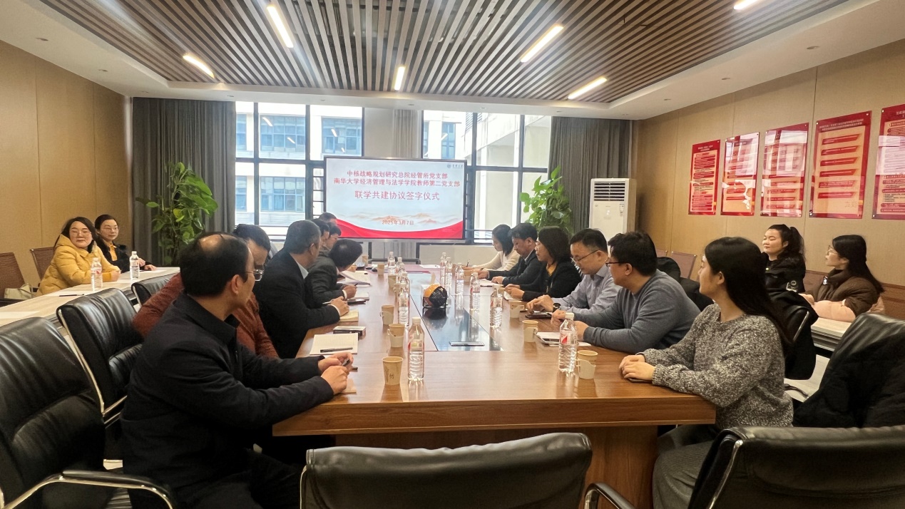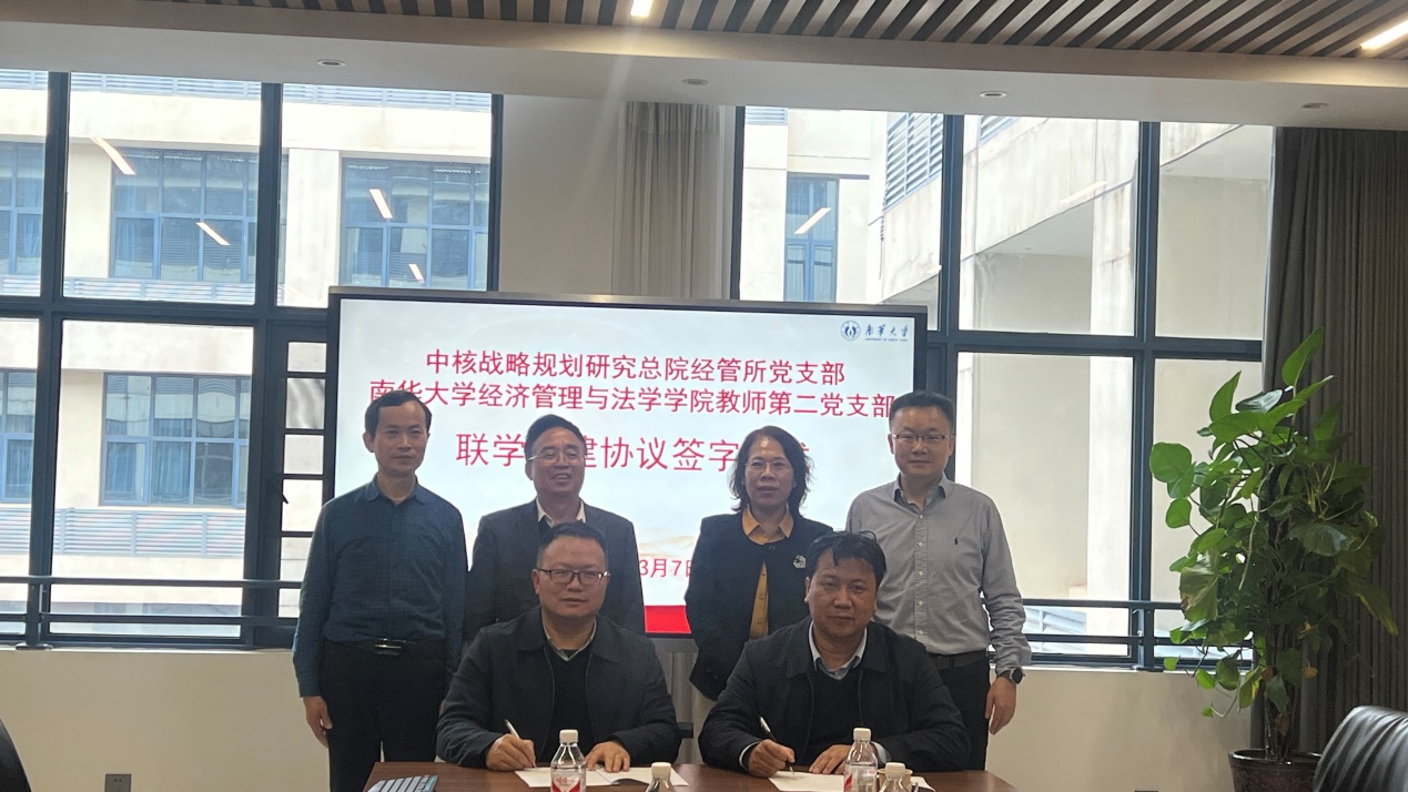 签字仪式由南华大学副校长陈国民主持,校党委委员刘文君、学院党委书记胡海波、院长李玉琼和中核战略规划研究总院经管所的相关同志出席了签字仪式。在签字仪式上,第二教师党支部书记游战武和中核战略规划研究总院经管所党支部书记韩绍阳分别介绍了各自党支部的基本情况、党建工作特色以及未来发展规划,并表达了通过联学共建实现共同进步的期望。根据协议,双方党支部将在组织联建、理论联学、业务联动、资源联享等方面开展深度合作,以期共同提升党建工作水平、增强党员理论素养、推动党建与业务工作深度融合、丰富党员教育形式、联合打造具有特色的党建品牌。