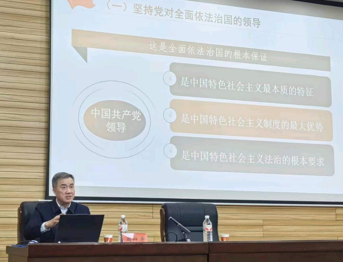 周叶中教授以“以习近平法治思想为指导,为基本实现社会主义现代化提供坚强法治保障”为主题,系统阐释了习近平法治思想的核心内涵与时代价值。他从“法治是现代化国家的基本要素”、“法治是中国式现代化的重要保障”等重要论断出发,深入解读了“十二个坚持”所构成的科学体系,强调坚持党对全面依法治国的领导、坚持以人民为中心、坚持中国特色社会主义法治道路的根本意义。讲座过程中,周教授引经据典、深入浅出,既有理论高度,又贴近现实关切,激发了师生对法治建设的深入思考,为在场听众呈现了一幅体系完整、逻辑严密的新时代法治中国建设蓝图。