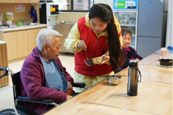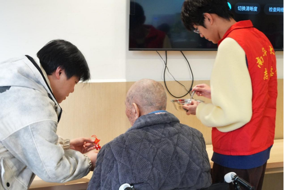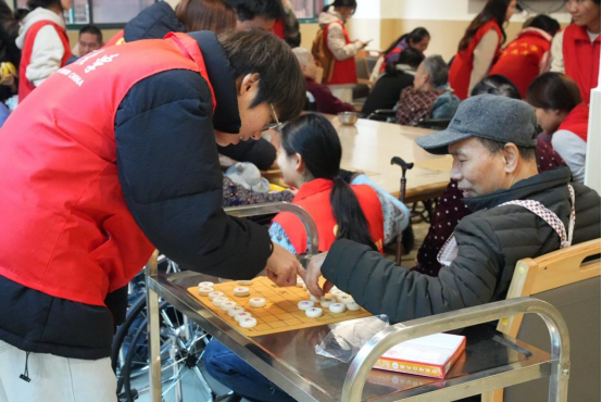 活动室的另一角,各类互动活动有序开展。象棋棋盘次第铺开,志愿者俯身与老人对弈,双方凝神思考,在博弈中享受陪伴的乐趣;折纸与扭扭棒手工桌前,志愿者耐心地进行手把手引导,在指尖的翻折与缠绕中,手工作品随之成型,尽显温情。滚水瓶拿水果游戏同步展开,老人拿到水果时笑容灿烂,欢声笑语驱散冬日寂寥。中午,志愿者协助护工喂饭,边喂边拉家常,耐心话语与轻柔动作,让老人倍感重视与关爱,志愿者也在相处中学会共情倾听。