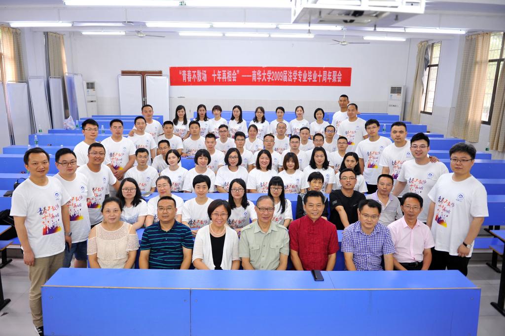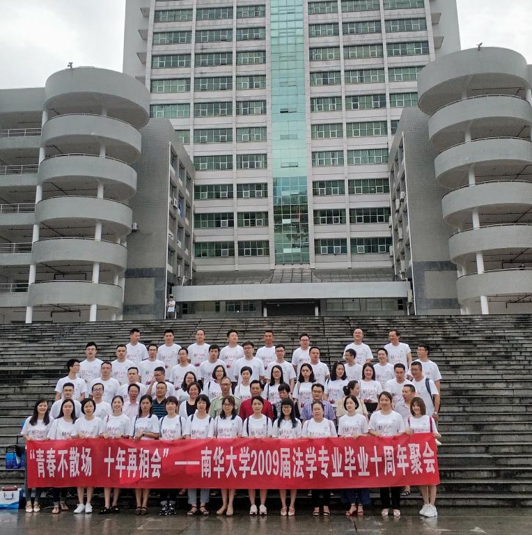 时光如同指尖流过的细沙,转眼间已是十年后的浅夏。在缕缕栀子幽香,浓浓的梧桐绿意中,7月6号,南华大学2009届法学专业毕业生迎来了他们十周年的聚会,50多名校友齐聚南华大学MBA大楼,受邀出席的还有:现经管法学院院长王铁骊,原文法学院党委书记龙志坚,原文法学院法学系第一任系主任邹鲁军,原文法学院法学系第二任系主任马柳颖,现法学系副主任曾冰,以及李满成、蒋卫军、李俊梅、费赫夫、蒋福明和卢清华等多位领导和老师。
