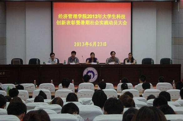 上图为:2013年6月23日晚,我院在图书馆一楼学术报告厅召开大学生科技创新工作表彰暨暑期社会实践动员大会。