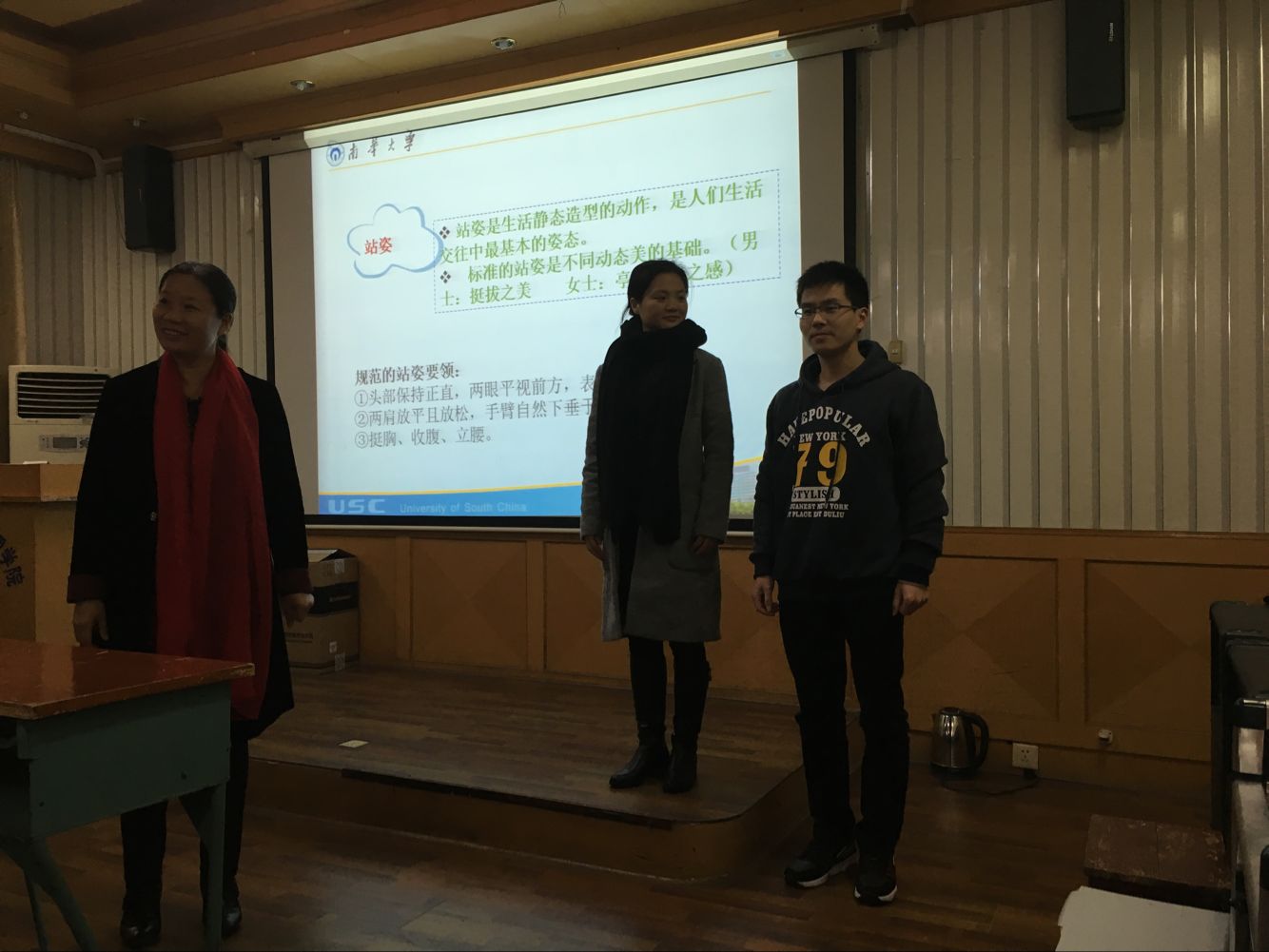 老师的示范中和自己的亲身体验中学习到许多知识。比如正确站立姿势女士应该是身体立直,右手搭在左手上,自然贴在腹部,右脚略向前靠在左脚上成丁字步,坐着的时候女生应该双腿并拢并斜放与地面呈45度角等等。并邀请了两位同学上台演示。