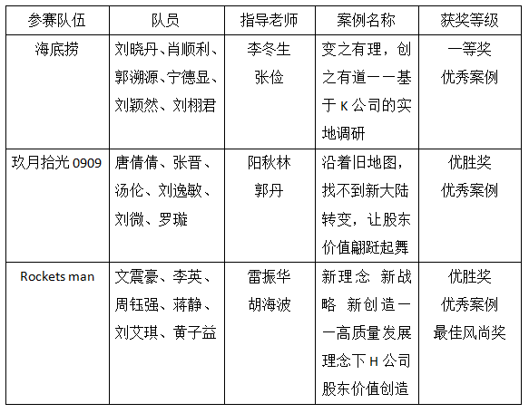 本次比赛共有来自湖南大学、中南大学、南华大学、湘潭大学、中南林业科技大学等大学的60余只代表队参加。南华大学共有3支会计专业研究生队伍(玖月拾光0909团队、海底捞团队、Rockets man团队)在初赛中脱颖而出,顺利入围复赛,其作品均被评选为优秀案例。在经过复赛,决赛激烈的角逐后,由管理学院李冬生老师、张俭老师指导的海底捞团队荣获一等奖,李冬生老师,张俭老师获优秀指导教师奖。玖月拾光0909团队和Rockets man团队获得优胜奖,文震豪同学获得最佳风尚奖。