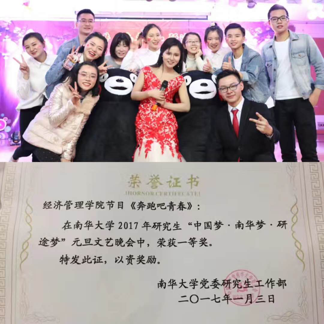 本次晚会以“中国梦·南华梦·研途梦”为主题,节目精彩纷呈。2016MPAcc的同学积极参与,2016级宋开阳和叶子琳同学在其中担任主持人,李娇姣同学与药学专业戴诗琴和简鸣二胡演奏的悠扬《弦之韵•南华情》,鸣奏出浓浓南华情;2016级会计专硕10多名同学歌伴舞《奔跑吧青春》,极具感染力的歌声、流畅的声线、娴熟的唱法,稳健的台风无一不吸引着台下的观众,并在元旦汇演中获得了一等奖。艾洋锐、彭蓓姿参与的惟妙惟肖的小品表演《致青春》,令人捧腹的角色反串,引得观众爆笑连连,也让同学们重温了那些年一起追逐的岁月。晚会在欢快气氛中圆满落幕。