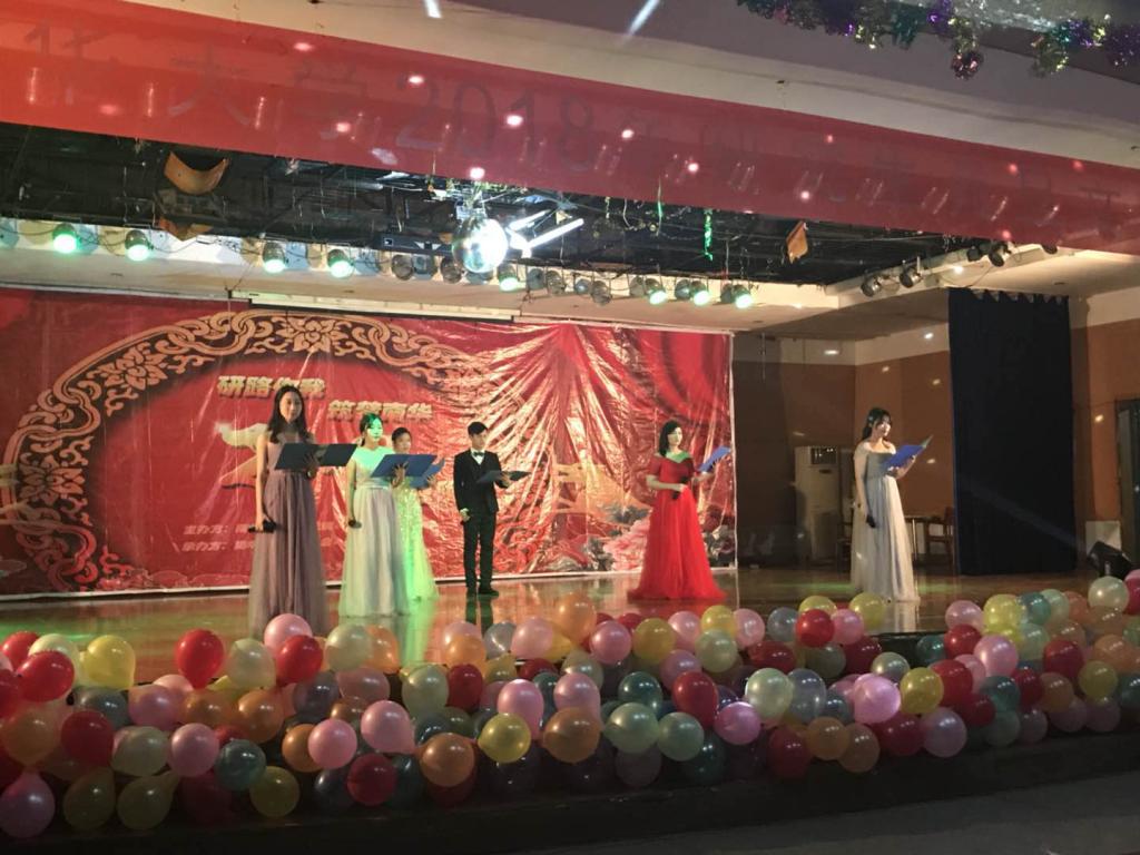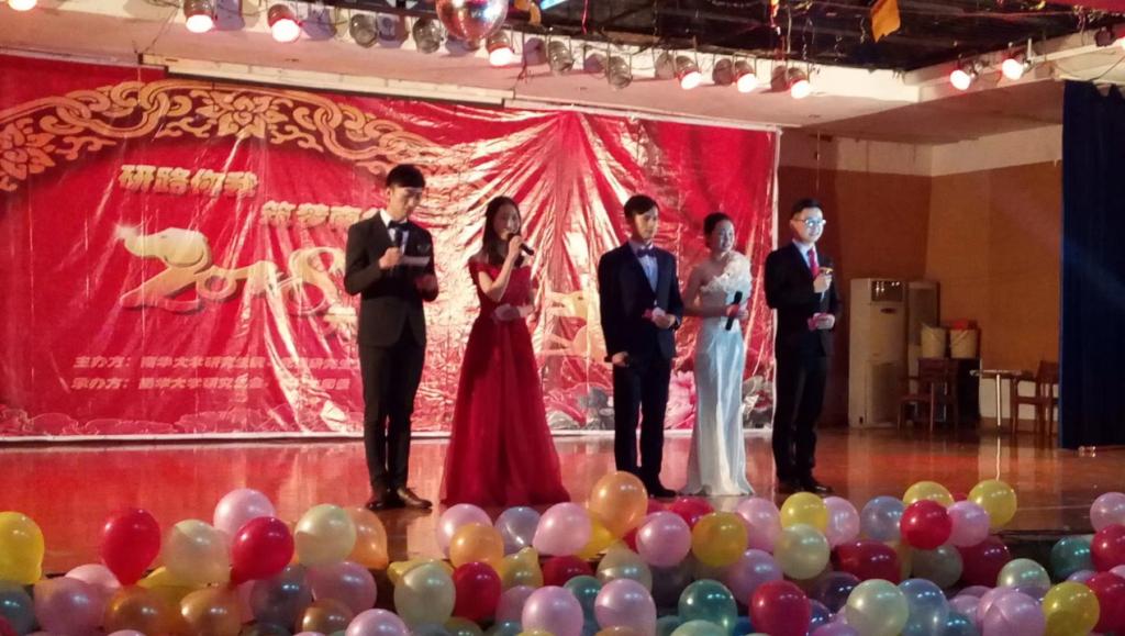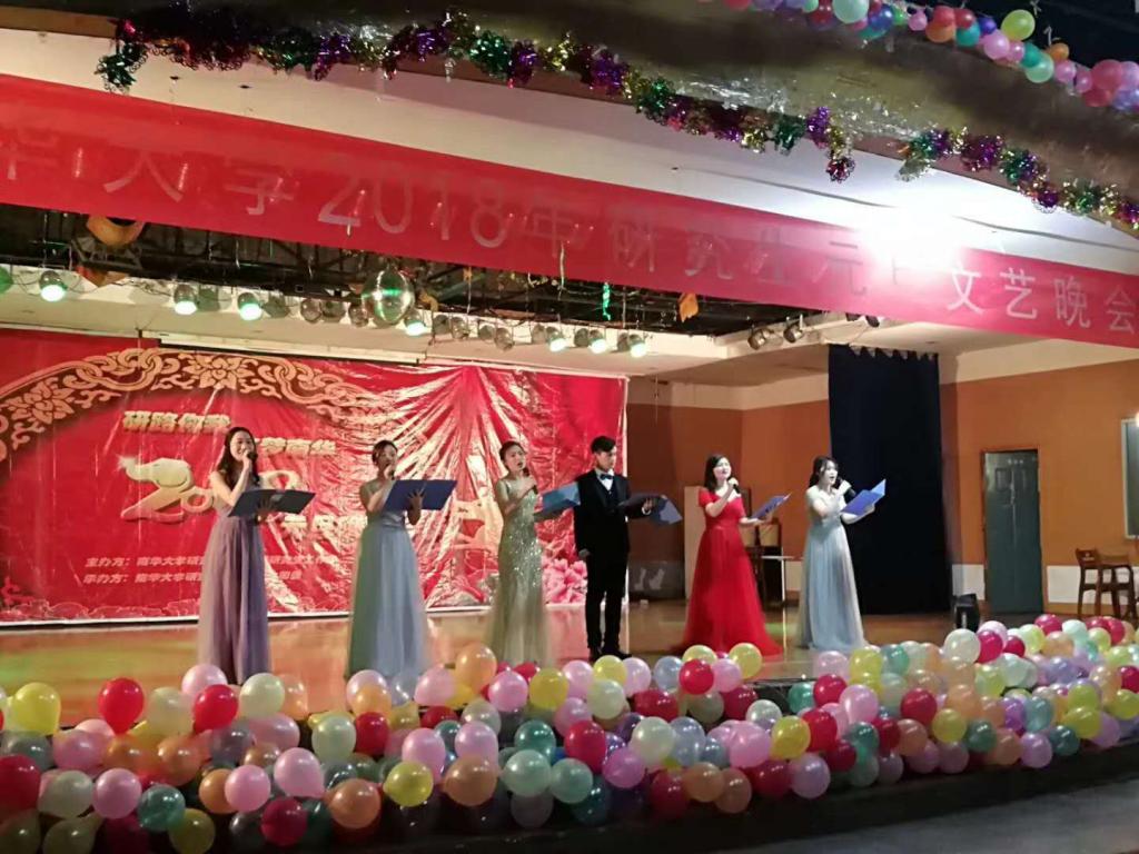 2018年1月1日晚七点,在南华大学北校食堂四楼,举行一年一度的研究生元旦晚会,本次元旦晚会由宋开阳、贺思仪等四位同学担任主持人。