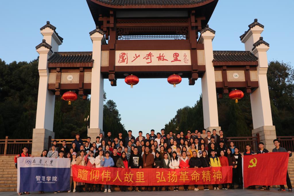 三个多小时的车程中,老师和同学们一同进行了党政理论知识抢答、数字炸弹、猜歌名等游戏。师生们还一起唱起了红歌,大家气氛融洽,兴致高涨。一行人到达韶山后,前往毛泽东同志的铜像广场,毛泽东同志纪念馆和故居,刘少奇铜像,参观刘少奇同志故居、刘少奇同志纪念馆等景点。在红色之旅行程接近尾声之时,全院师生在刘少奇故里牌匾下合影留念。