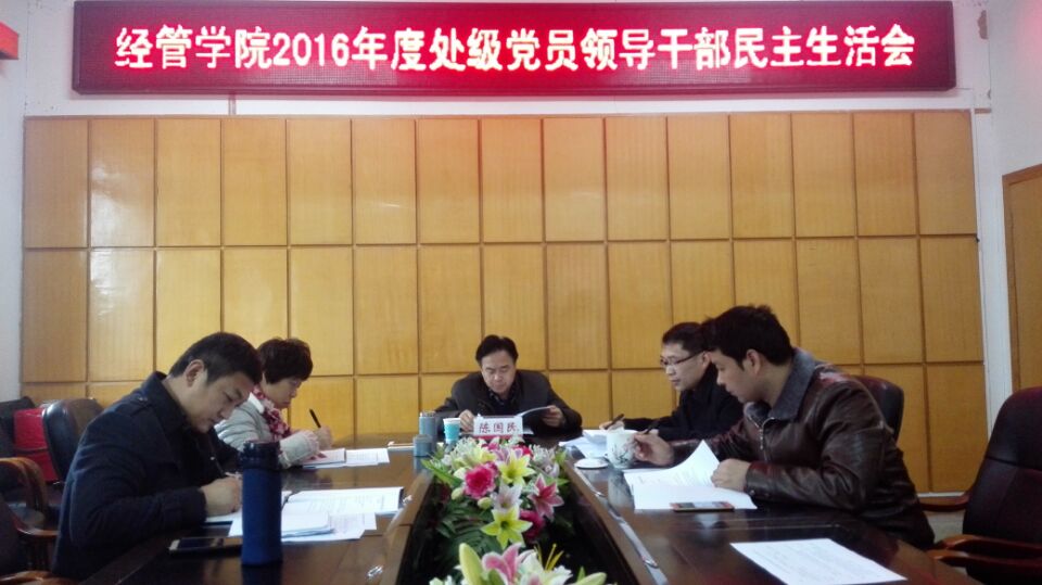 2017年2月23日,经管学院召开处级党员领导干部2016年度民主生活会,校党委委员、副校长陈国民出席并全程指导。院党委书记谢四平主持会议,阳秋林副院长、谭建跃副书记、胡海波副院长等参加会议。