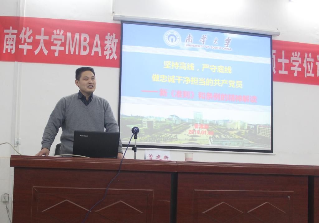 1月7日下午,由经济管理学院、公共卫生学院、护理学院联合承办的“理论文化讲坛”在南华大学MBA教学中心一楼报告厅圆满举行。南华大学校纪委副书记、监察处处长曾建新担任主讲,三院全体党政领导、教职工参加了此次讲座。