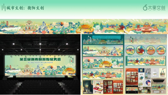 “或许二、三线城市的文旅是团队弯道超车的逆势增长点。”于是,团队开发了以城市文化为特色的新锐品牌“果潮社”。2024年衡阳旅发大会时期,设计总监王冰灵完成了衡阳长卷插画的绘制,并应用在南岳区烟草局的文创开发以及旅发大会的品牌宣传上。