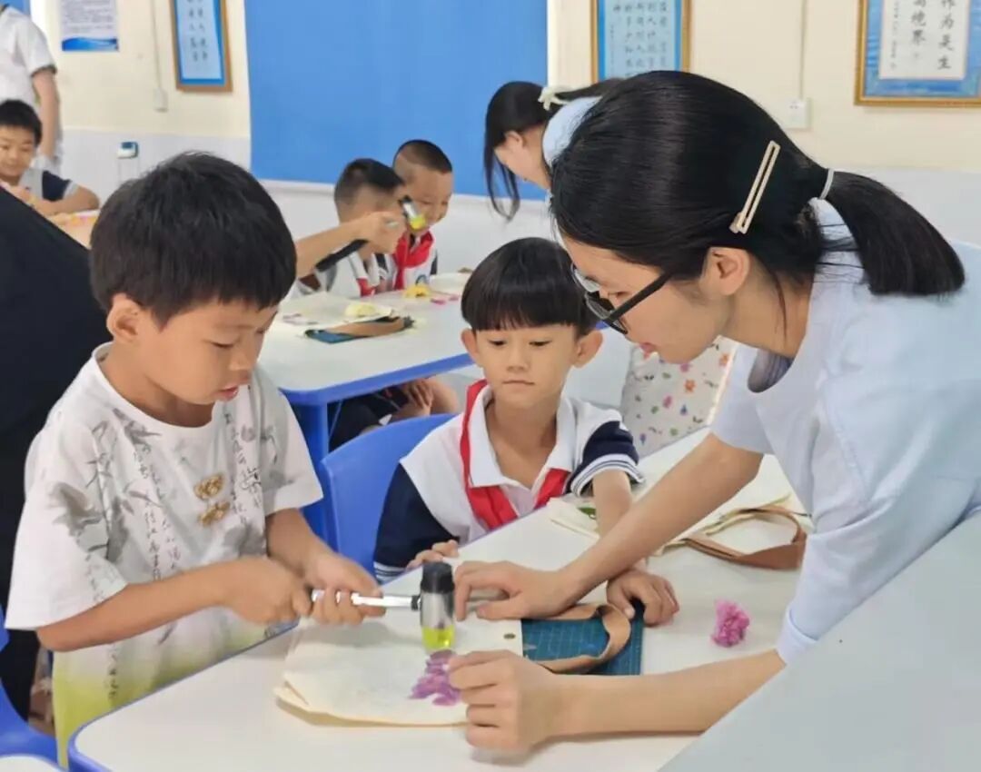 志愿者首先介绍压花艺术的起源与发展,随后展示了风格各异的压花成品。理论教学结束后,每组都由志愿者全程陪伴实操。小朋友们小心翼翼地挑选花瓣,按照步骤制作压花作品,遇到问题时,志愿者们耐心解答、细心帮助。最后,大家对作品进行调整完善,一件件充满童趣与创意的压花作品由此诞生。作品完成后,大家为这些精美的压花作品合影留念。