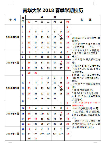 南华大学2018春季学期校历
