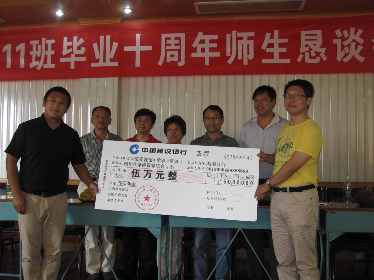 拳拳赤心,难忘师恩。校友们为会计系集资捐赠人民币五万元,专项用于会计系的建设发展。会计系主任胡海波博士代表会计系接受了校友们的捐赠,并表示一定将捐款利用好,造福桑梓。