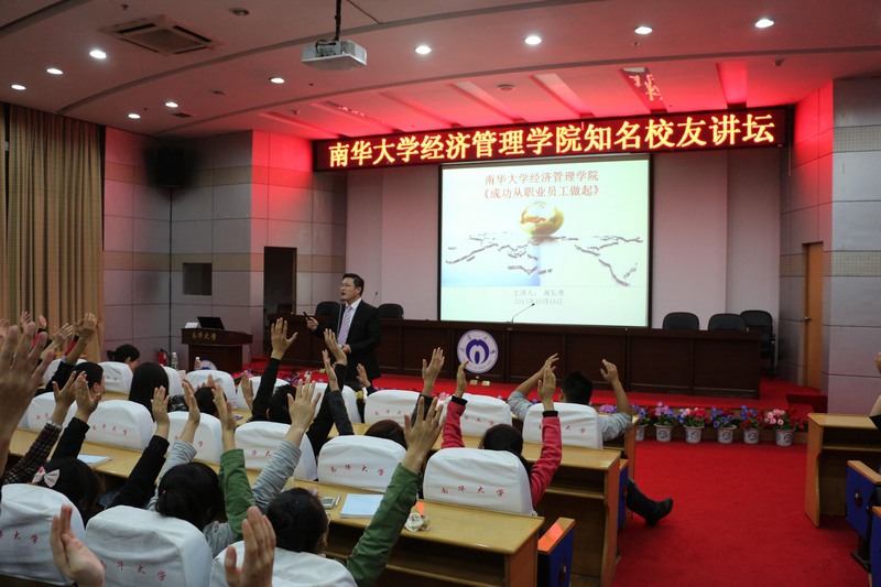 11月16日,在我校55周年校庆之际,不少校友纷纷回到母校,共襄盛举。我院邀请知名校友北京至善明德管理咨询有限公司董事长、清华大学总裁班特聘讲师、国内顶尖实战培训讲师高长勇教授在图书馆报告厅为广大师生做了题为“成功从职业员工做起”的精彩讲座。全场座无虚席,气氛热烈。