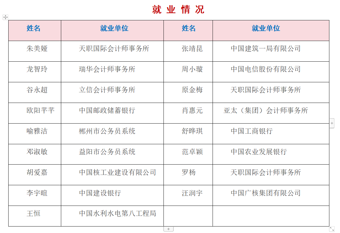 会计学国际会计(ACCA)方向班的同学就业率和就业质量明显好于其他文科类专业,据不完全统计,毕业班学生的初次就业率近90%,就业单位主要集中在国内外大型会计师事务所、国家公务员、银行及上市公司等单位,部分就业情况可见下表: