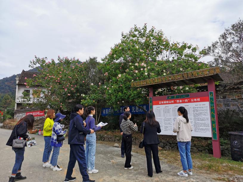 图1 公管系师生观看正山镇阳山古村“四会一约”公布栏