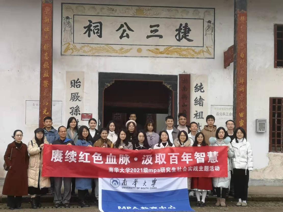 2021年12月12日,南华大学MPA教育中心联合全国社会科学普及基地军工及地域文化研究中心举办了“赓续红色血脉·汲取百年智慧”实践教学活动。MPA教育中心李忆华、胡琦两位导师带领2021级公共管理专业硕士(MPA)研究生赴岳北农工会旧址追寻红色记忆,了解革命先烈的光荣事迹,传承红色基因,弘扬和继承伟大革命精神。