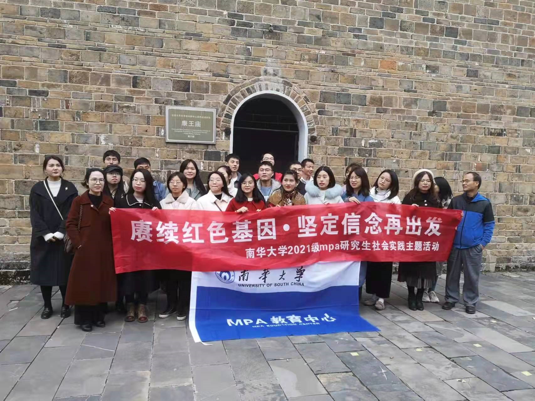 2021年12月25日,南华大学MPA教育中心联合全国社会科学普及基地军工及地域文化研究中心举办了“赓续红色血脉·坚定信念再出发”实践教学活动。MPA教育中心李忆华、胡琦两位导师带领2021级公共管理专业硕士(MPA)研究生赴康王庙追寻红色记忆,了解伟大的农民抗争史,以史为鉴,汲取历史智慧。