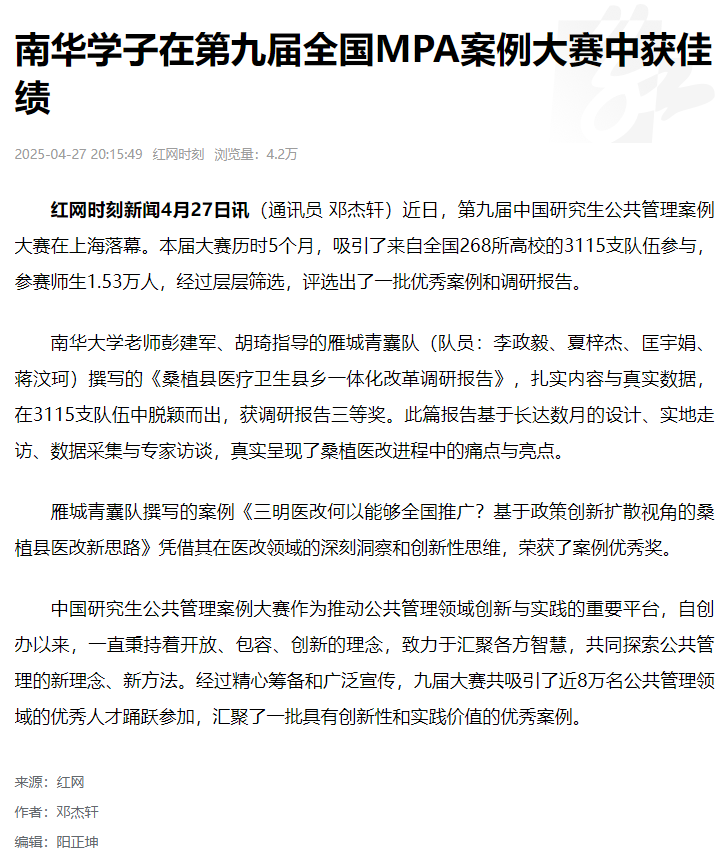 南华大学老师彭建军、胡琦指导的雁城青囊队(队员:李政毅、夏梓杰、匡宇娟、蒋汶珂)撰写的《桑植县医疗卫生县乡一体化改革调研报告》,扎实内容与真实数据,在3115支队伍中脱颖而出,获调研报告三等奖。此篇报告基于长达数月的设计、实地走访、数据采集与专家访谈,真实呈现了桑植医改进程中的痛点与亮点。