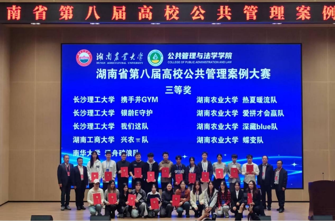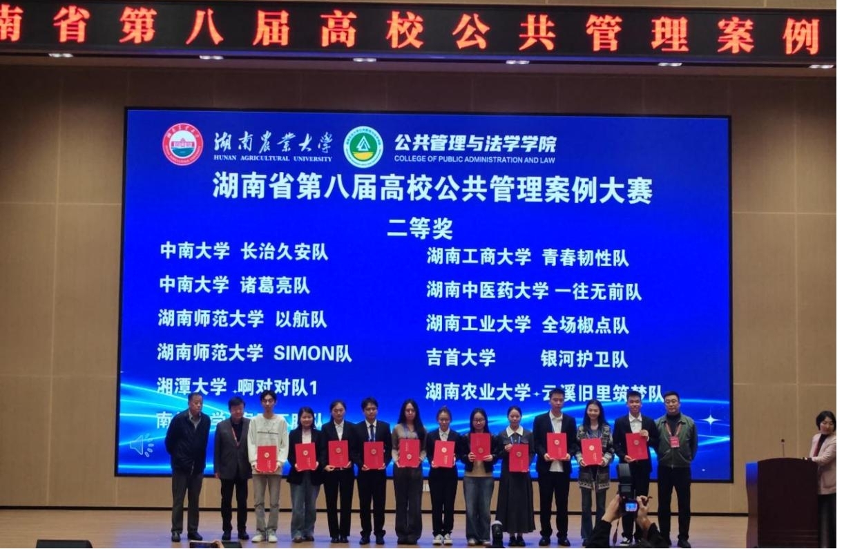 2025年11月1日,由湖南省教育厅主办,湖南农业大学承办,中国行政管理学会、湖南省行政管理协会协办的“湖南省第八届高校公共管理案例大赛”在长沙岳麓山实验室顺利举行。南华大学beats365唯一官方网站公共管理系“案无不胜队”、“沅舟破浪队”分别荣获二等奖和三等奖,续写我校公共管理学科在湖南省公共管理案例大赛获得的傲人成绩。